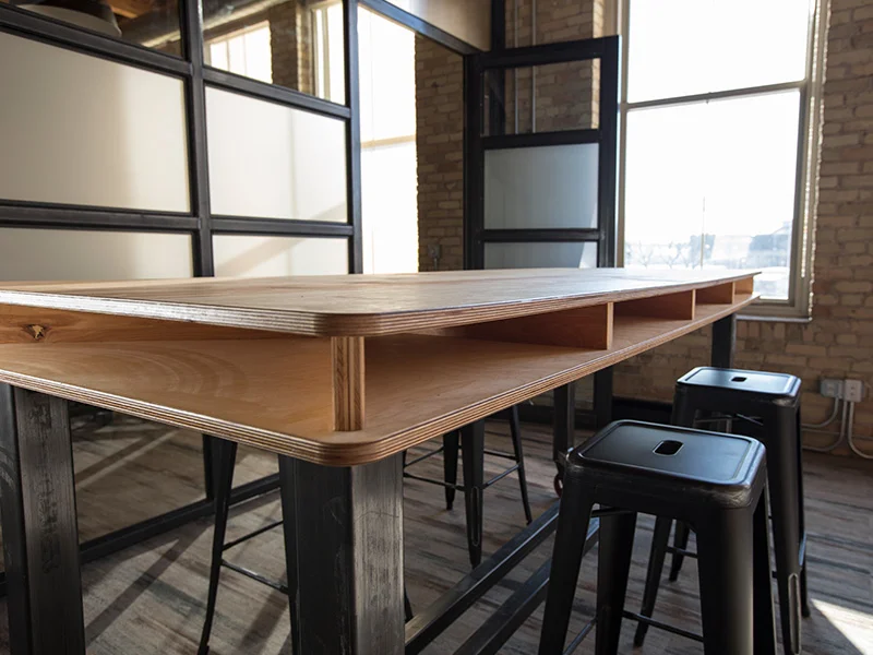 Employees wanted dynamic workspaces that could be rearranged and used in many different ways - so we built two high-top tables with wheels so they can be moved around easily. The design offers a space to "hide" technology when employees need to focus. We also created coffee-shop style tables to spark creativity and be a causal meeting space. Finally, we built a huge custom cork board to pin inspiration. And the big pallet wall? Well that's just awesome.